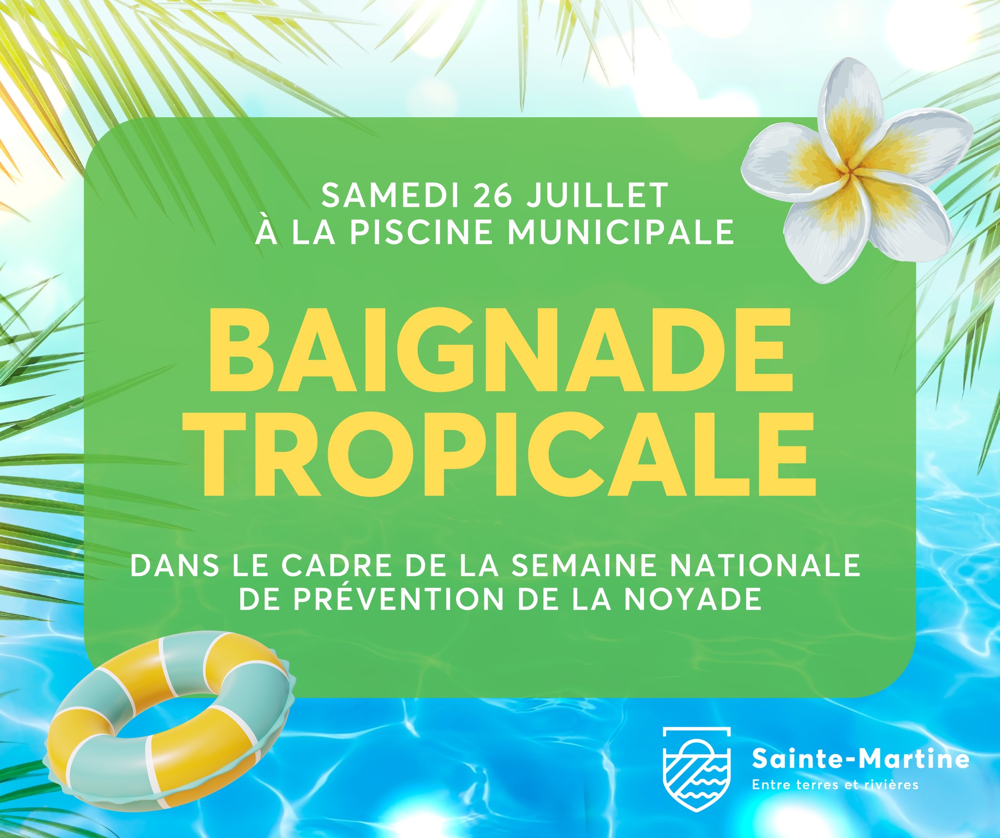 Dans le cadre de la Semaine nationale de prévention de la noyade, joignez-vous à nous le 𝘀𝗮𝗺𝗲𝗱𝗶 𝟮𝟲 𝗷𝘂𝗶𝗹𝗹𝗲𝘁 pour une 𝗯𝗮𝗶𝗴𝗻𝗮𝗱𝗲 𝘁𝗵𝗲́𝗺𝗮𝘁𝗶𝗾𝘂𝗲 à la piscine municipale (5, rue des Copains)!