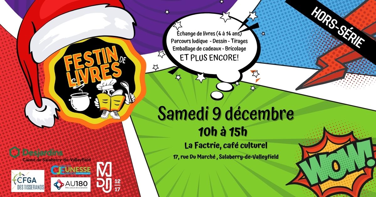 Le Festin de livres aura lieu le 9 décembre prochain de 10h à 15h. Il offre aux jeunes de 4 à 12 ans la possibilité de venir échanger des livres et aussi de choisir quelques jeux et jouets usagés à offrir à leurs frères et sœurs (ou encore de s’offrir un cadeau pour eux) pour Noël.