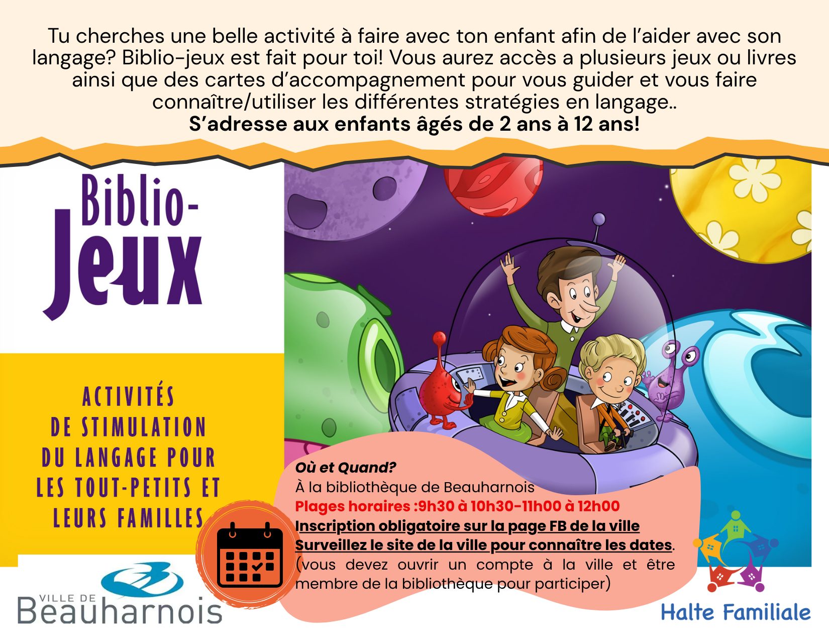 Tu veux passer un bon moment avec ton enfant tout en stimulant son langage? Biblio-Jeux est fait pour toi! Grâce à une panoplie de jeux et de livres adaptés, tu pourras accompagner ton enfant dans l’apprentissage du langage de façon amusante et interactive. Activité pour les enfants de 2 à 12 ans À la bibliothèque de Beauharnois Plages horaires : 9h30 à 10h30 et 11h00 à 12h00 Inscription obligatoire sur la page Facebook de la Ville — surveillez les publications pour connaître les dates! Une belle activité à partager en famille pour apprendre en s’amusant! #beauharnois #haltefamiliale #bibliojeux #Apprentissagee #famille #language Les samedis 18 octobre, 15 novembre, 29 novembre 2026
