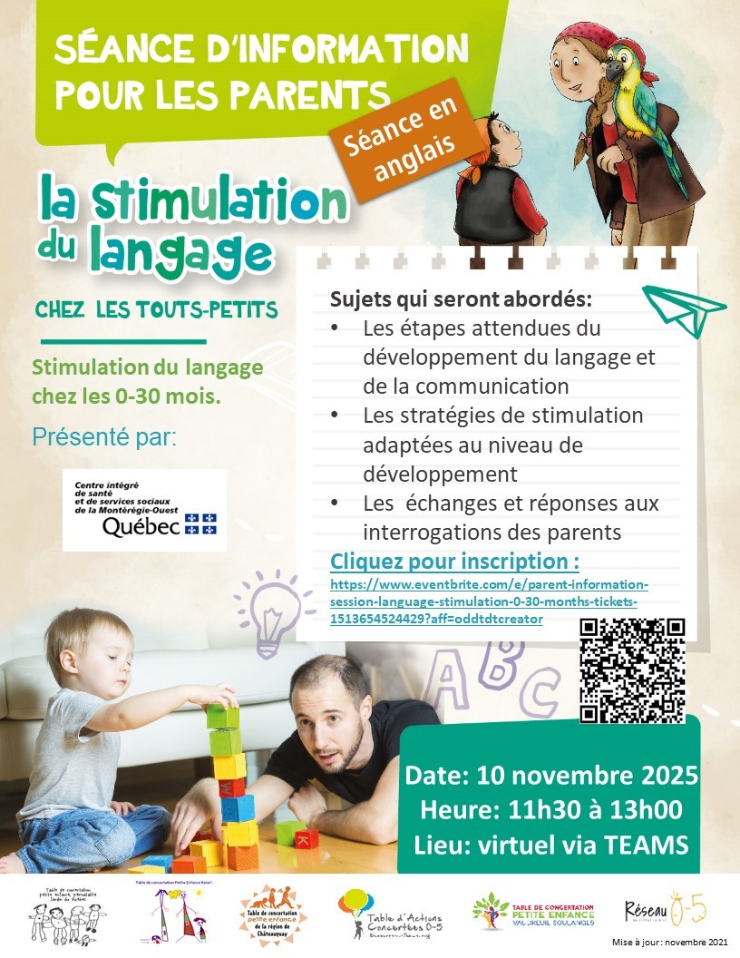 Les Moussaillons 2-3 ans Atelier de stimulation du langage et stimulation précoce animer en dyade parent et enfants.Les objectifs visés sont : Aider les enfants à développer son estime de soi, son autonomie; Favoriser les habiletés langagières de l’enfant par des activités ciblées en stimulation du langage; Permettre d’accroître et de maximiser le processus du développement des précurseurs du langage; Outiller et soutenir les parents afin qu’ils exploitent les bonnes attitudes quant à la stimulation du langage de leurs enfants; Amener les parents les parents à utiliser des stratégies d’intervention et des activités à la maison et par le fait même réinvestir dans leur quotidien des actions visant à multiplier les chances de réussite de leur enfant; Augmenter chez les parents la confiance en leurs compétences; Mieux informer les parents afin qu’ils développent de nouvelles compétences dans la stimulation de développement du langage de leur enfant de façon optimale. |