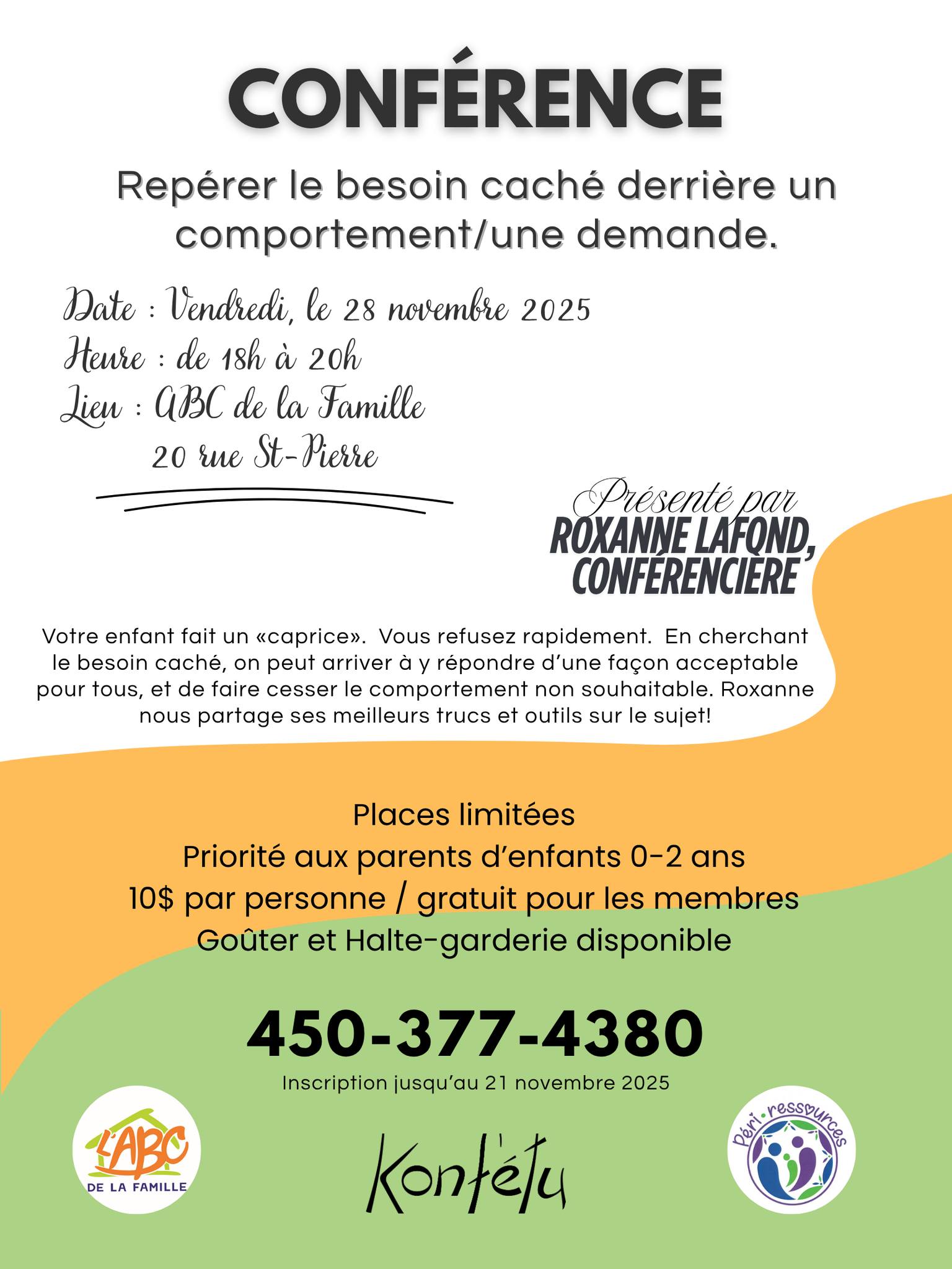 Atelier qui s’adresse aux parents d’enfants de 0-5 ans, discussion autour des réalités familiales. 9 h à 11 h Dans les locaux de la Halte, salle Georgette-Lefebvre Chaque mercredi matin Pour 10 semaines approximativement Pour s’inscrire, contacter la Halte familiale au 450 225-2725