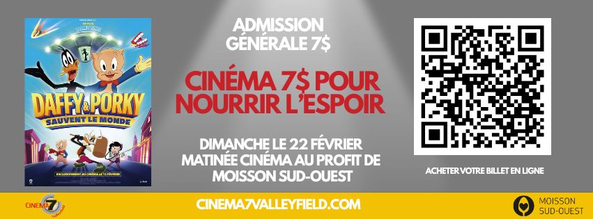 Le 22 février venez assister à une représentation du film Daffy et Porky sauvent le monde dans le cadre d'une levée de fond pour Moisson Sud-Ouest. Tous les profits de la vente de billets seront versés à Moisson Sud-Ouest. Un bac sera également installé à l'entrée du cinéma afin de reccueillir des dons de denrés non périssables avant la représentation. Pour acheter vos billets: https://cinema7valleyfield.com/ Dons de denrées suggérés: Boîtes de conserve avec des aliment prêt à manger contenant de la viande :Soupes « Chunky » avec de la viande, ragoûts, chili à la viande, thon, poulet, raviolis à la viande, etc. Repas rapides de pâtes :Macaroni au fromage Kraft Diner, sidekicks, ramen, etc. Produits d’hygiène (hommes et femmes):Savon, shampoing et revitalisant, dentifrice, déodorant, tampons, serviettes sanitaires, etc. |